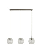 Revamp your living space with our 3 light bar pendant in a satin silver finish and clear glass shades. The glass ball shades make this a distinctive product to hang in your kitchen area whether it's above a kitchen island or a dining room table.
