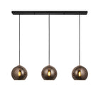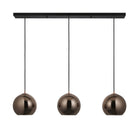 Effortlessly cool copper mirrored glass shades are suspended from matt black metalwork in this linear pendant.