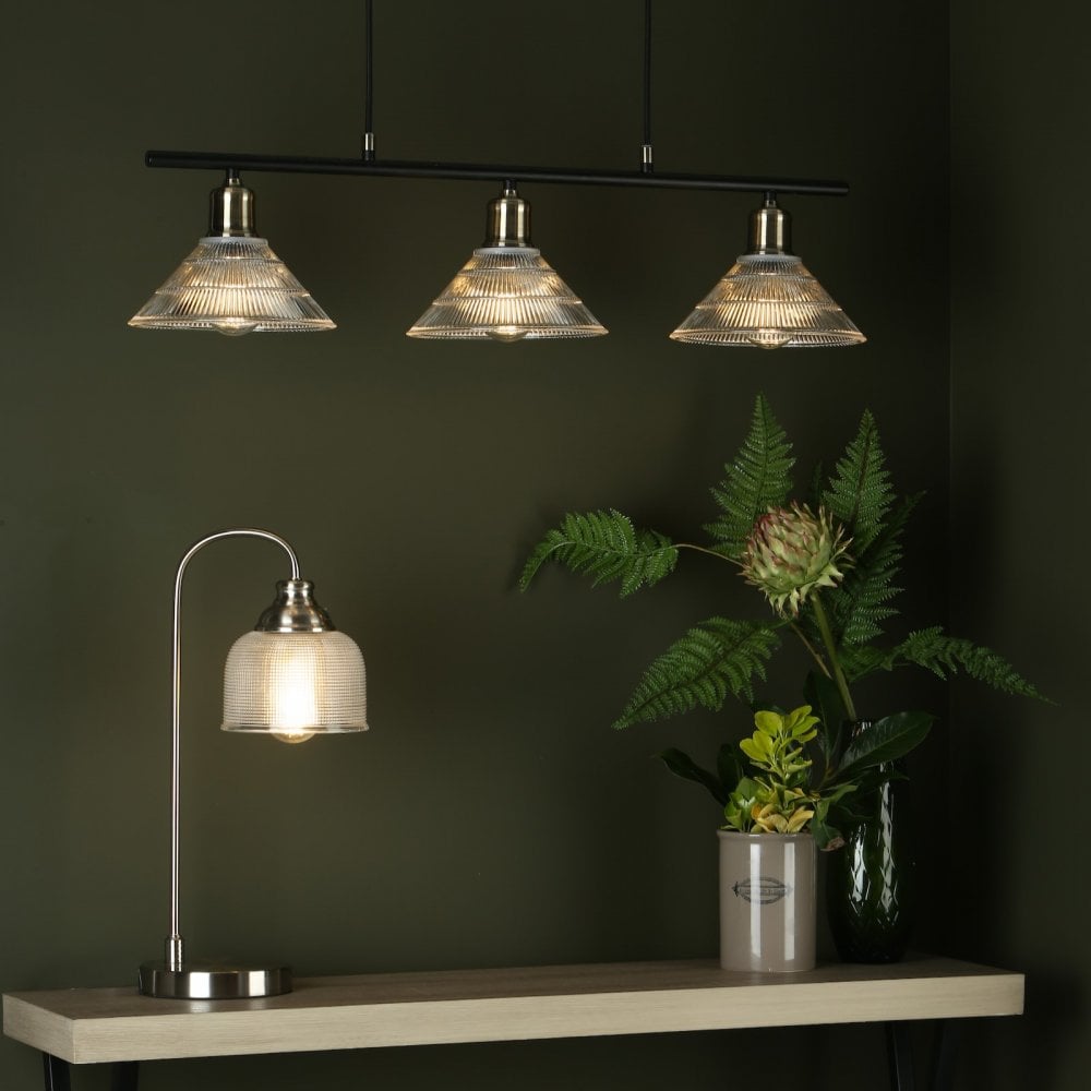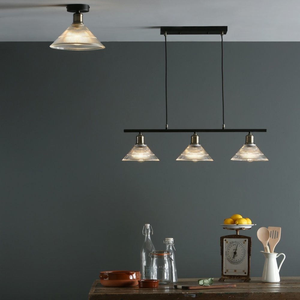 The prismatic shade offers an industrial style reminiscent of old factory lighting. The 3 light bar format lends its self to hanging over a long table or breakfast bar. Featuring 1m of black braided cable that can be shortened on installation. The Boyd 3 light bar pendant is suitable for sloped ceilings.