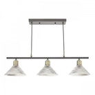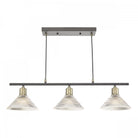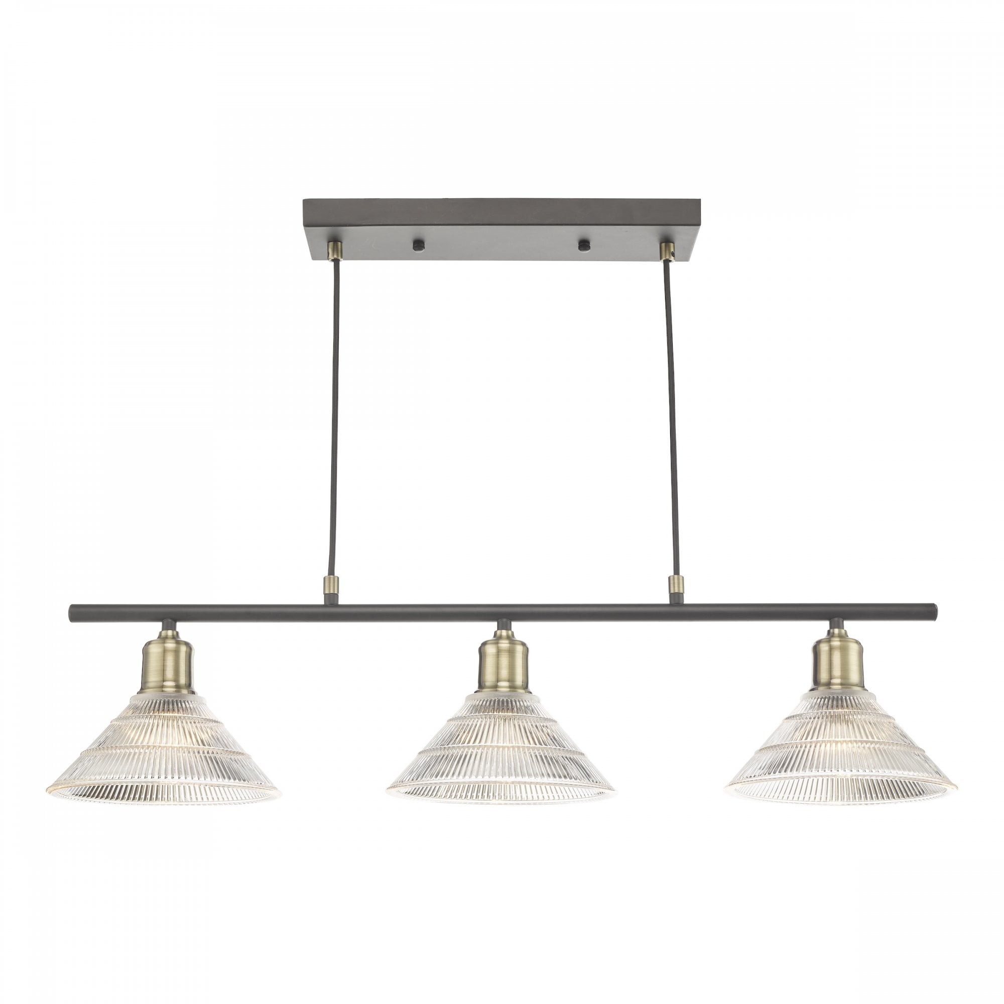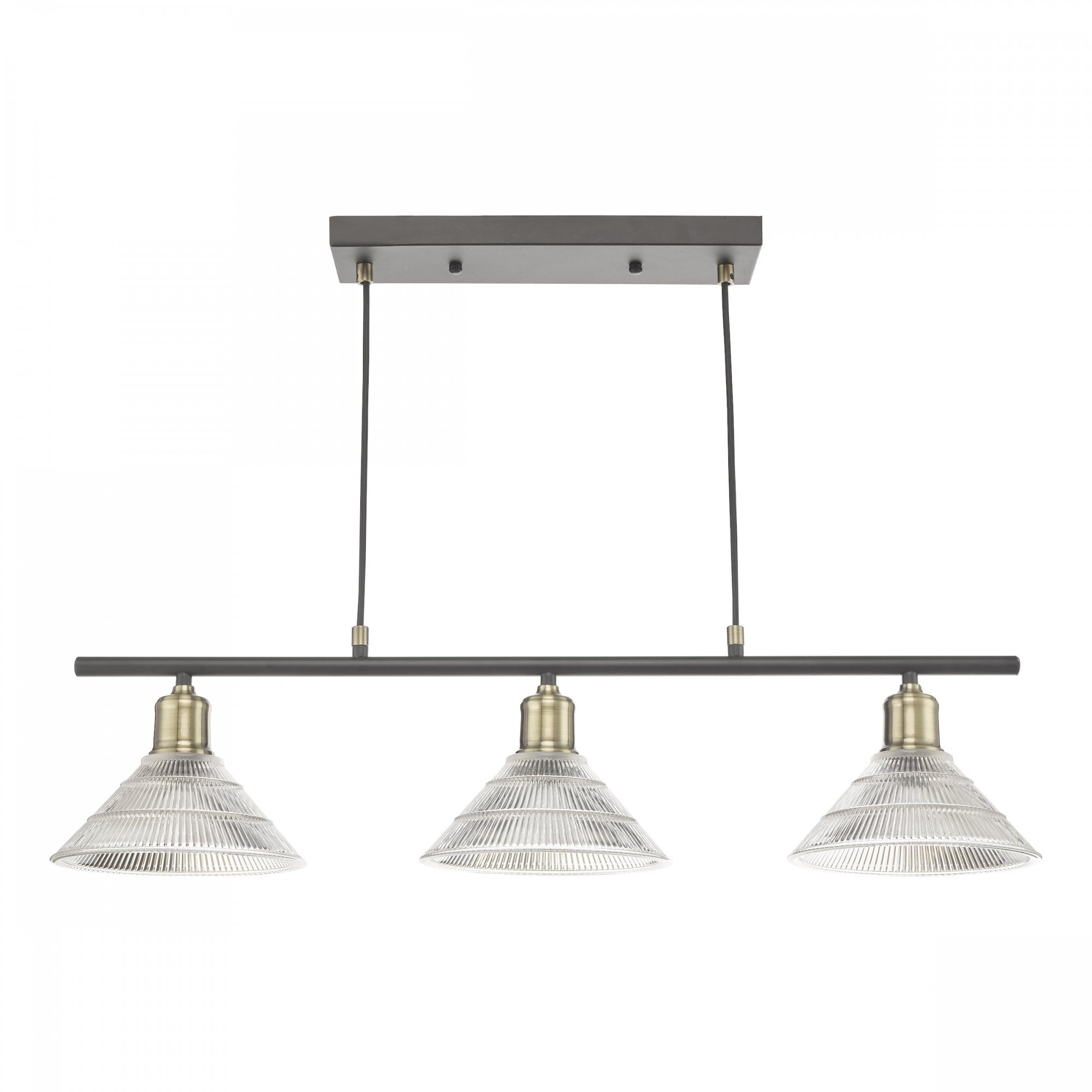 The Boyd 3 light bar pendant with prismatic shades and antique brass details. Is a great looking soft industrial bar pendant light.