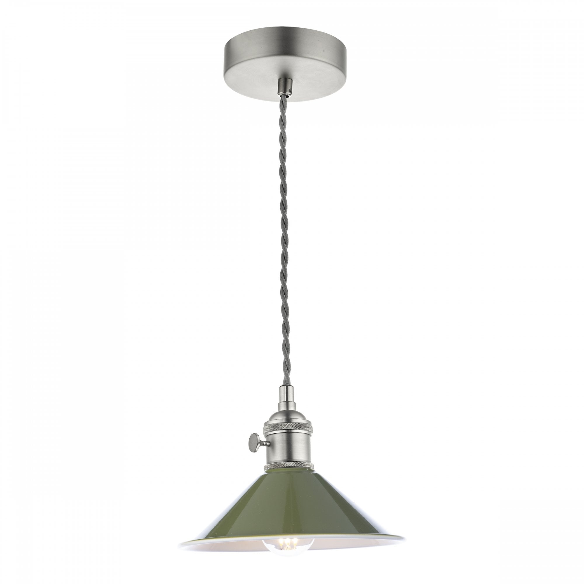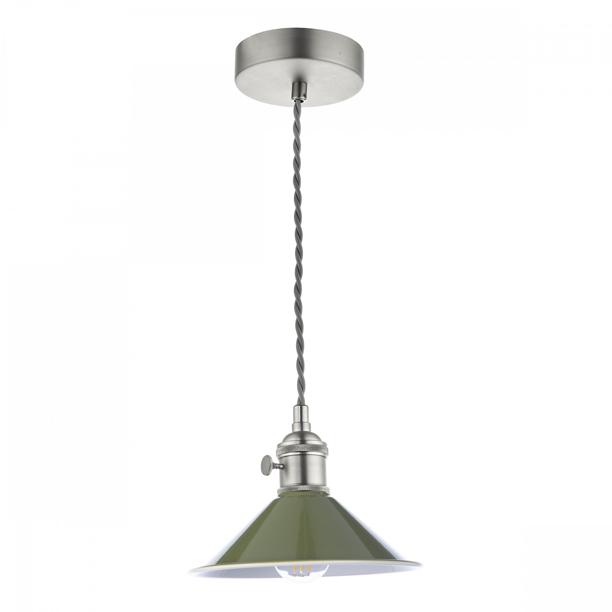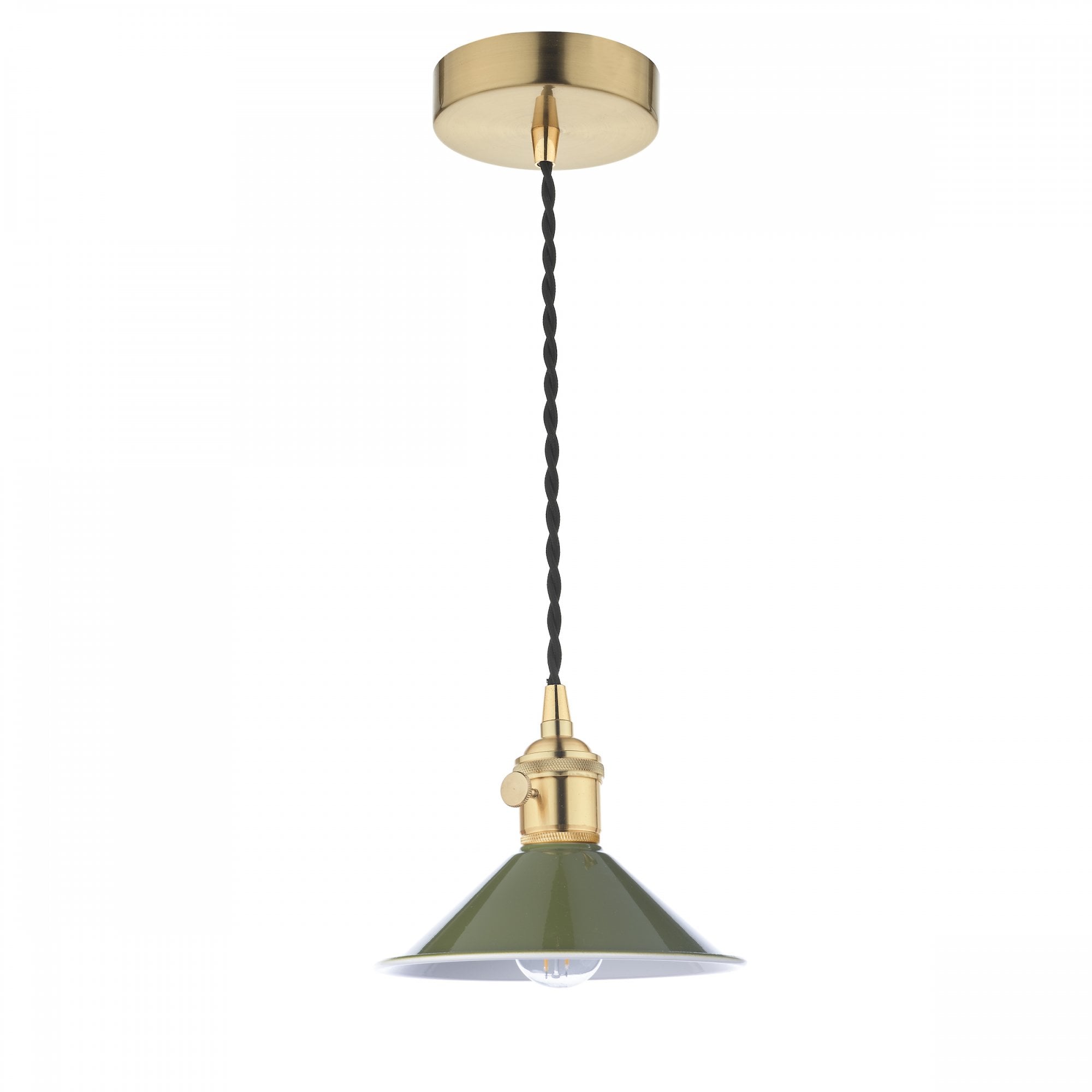 This all-metal version has a vintage-look cone shade in an earthy olive green finish and white inner, complemented by a sophisticated antique chrome finish ceiling rose and machined lamp holder.