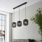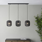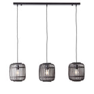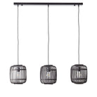 A simple and stylish three light pendant inspired by nature, with sustainably sourced dark bamboo cage, creating a soft warm light. Finished with matt black paint and dark wood detailing.