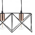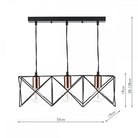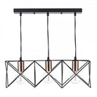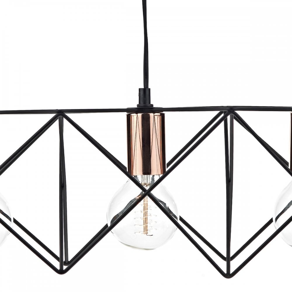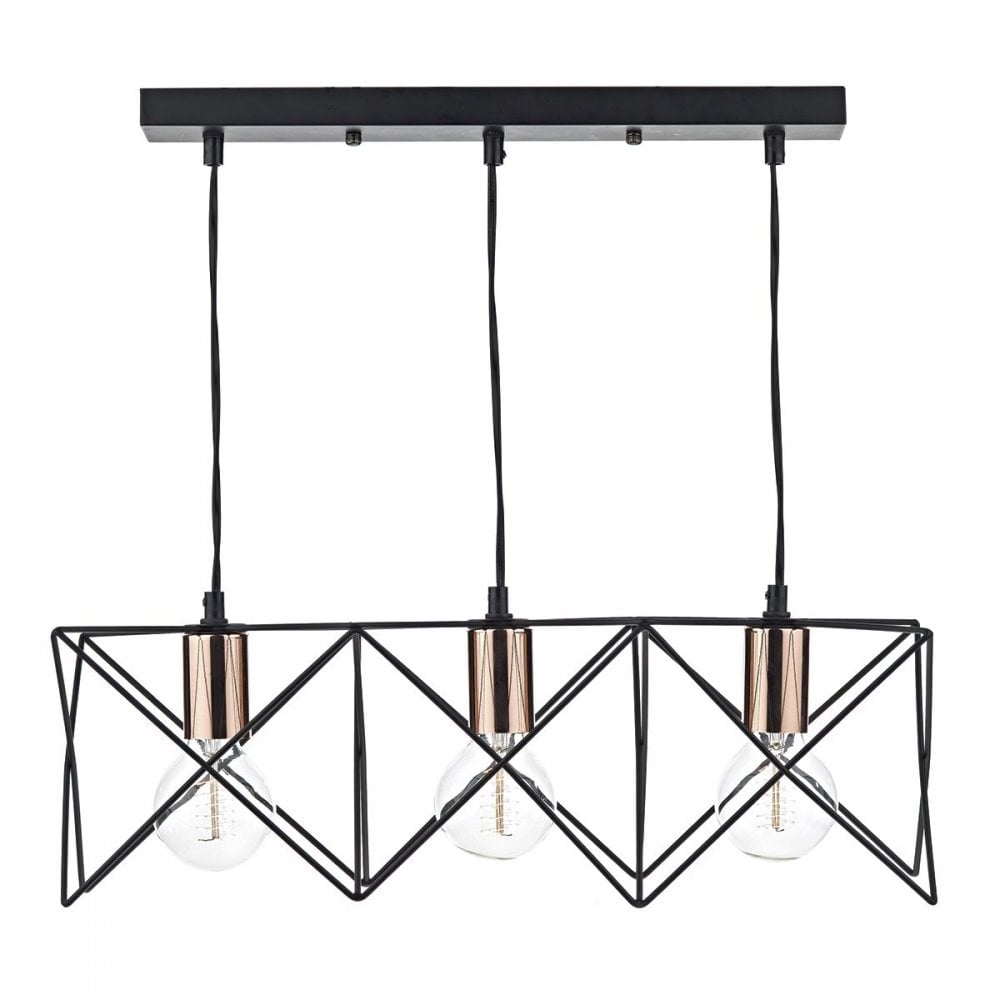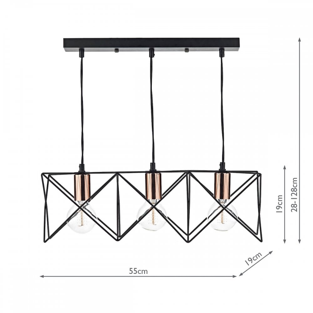 Generous 3 light (55cm long) over table bar pendant in matt black finish with polished copper lamp holder detail. Perfect for displaying decorative lamps. With the open metal work frames this fitting adds ambience to vintage and modern interiors alike. Height adjustable on installation to a maximum of 1.3 meters.