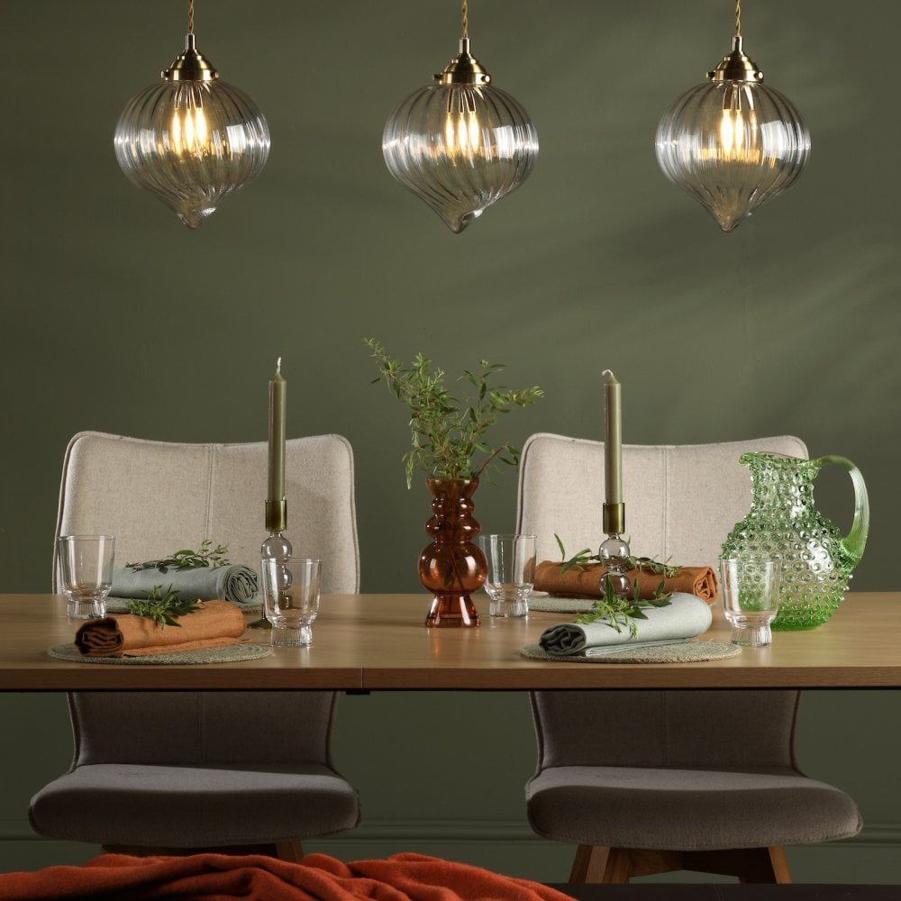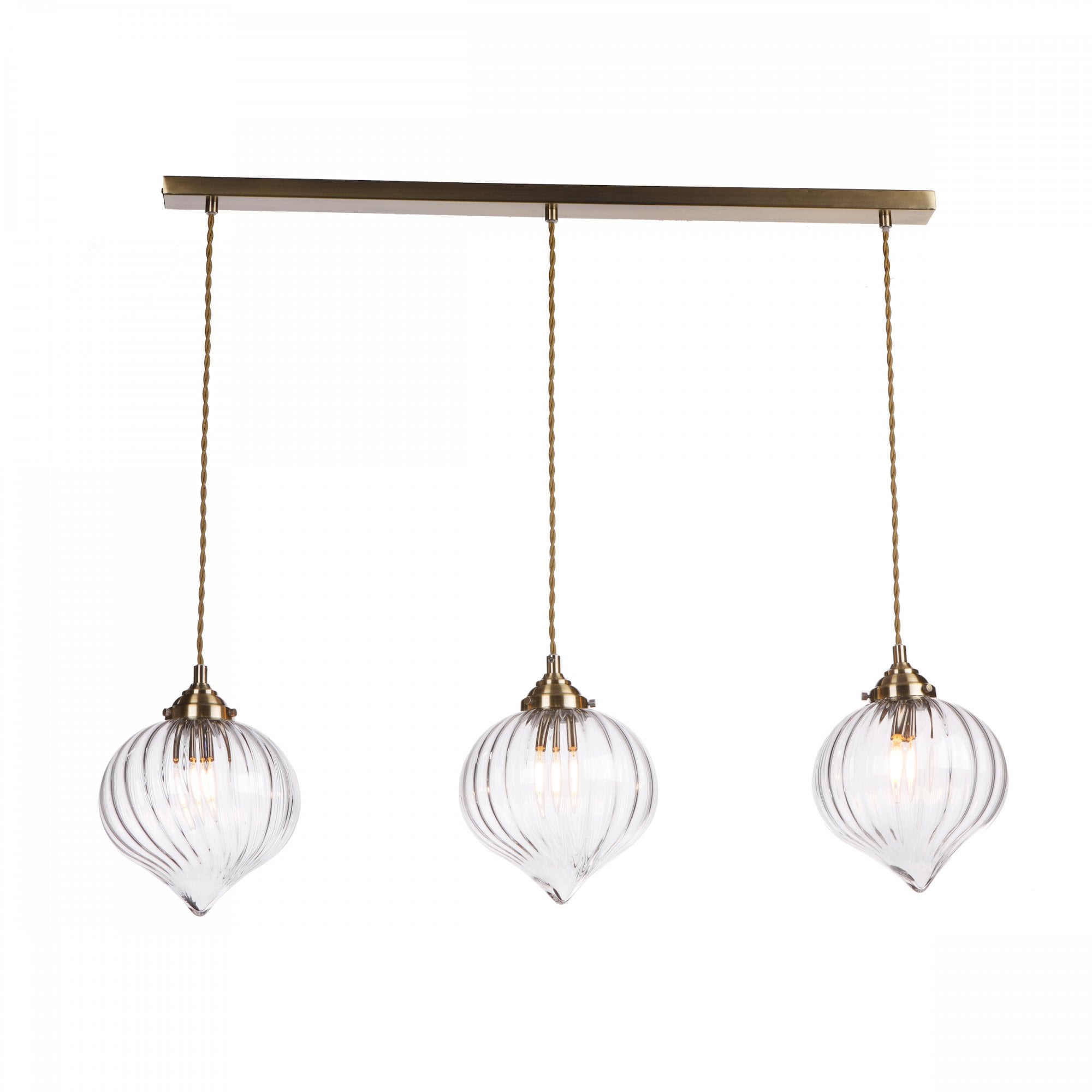 The Mya 3 Light Bar Antique Brass and Glass from dar lighting offers a contemporary twist on a traditional fixture. Quietly stylish and perfectly suited for a kitchen or dining room, the Mya 3 light bar pendant features a mouth-blown glass drop with a more contemporary soft waterfall ribbing, gently diffusing the light. The Mya 3 light bar pendant features a country cottage aesthetic, with an antique brass finish and brown braided cable.