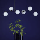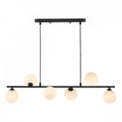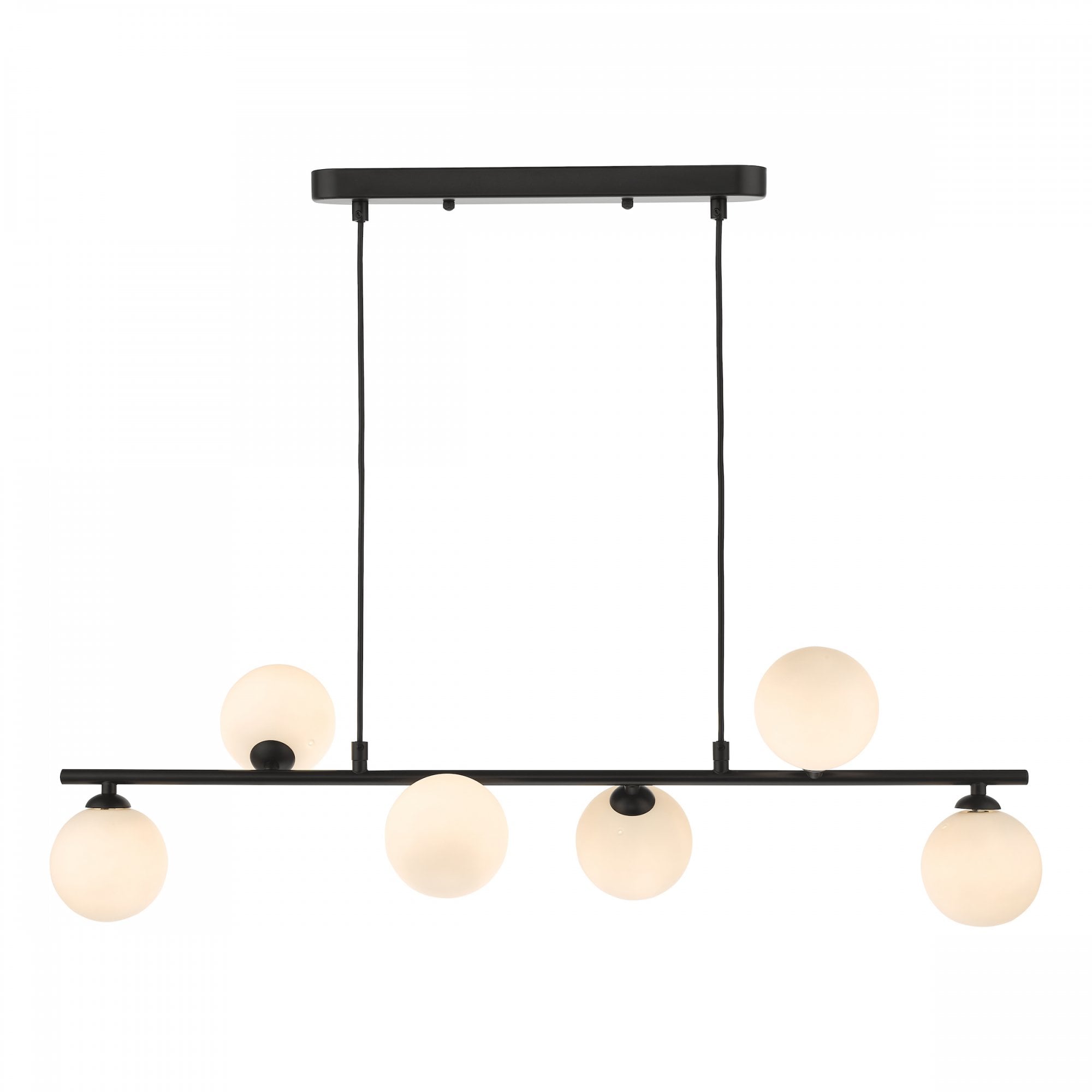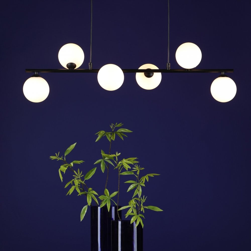The Spiral 6 Light Bar Pendant features opal glass globes spiraling around a suspended satin black bar. This contemporary fitting is perfect over a dining table or kitchen island.
