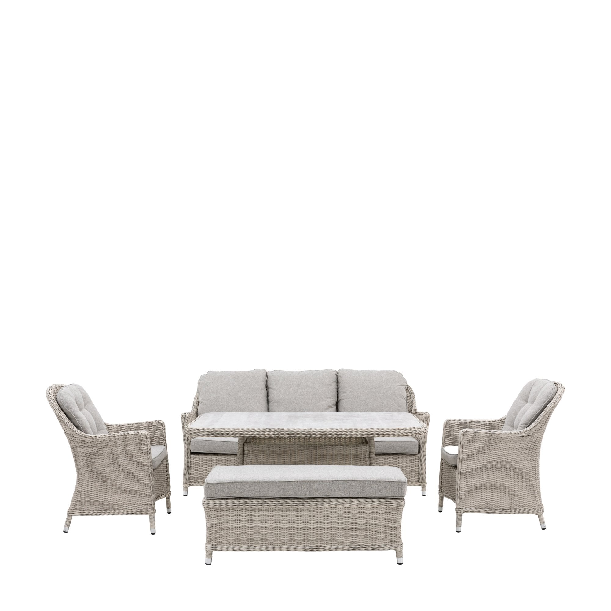Elevate your outdoor living with this stylish dining set. Crafted with a blend of rattan and plush cushions, it offers comfortable seating and a sophisticated look. The neutral color palette complements any outdoor decor, making it perfect for entertaining guests or relaxing with family. This versatile set can be used for both seating and dining, adding flexibility to your outdoor space.