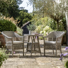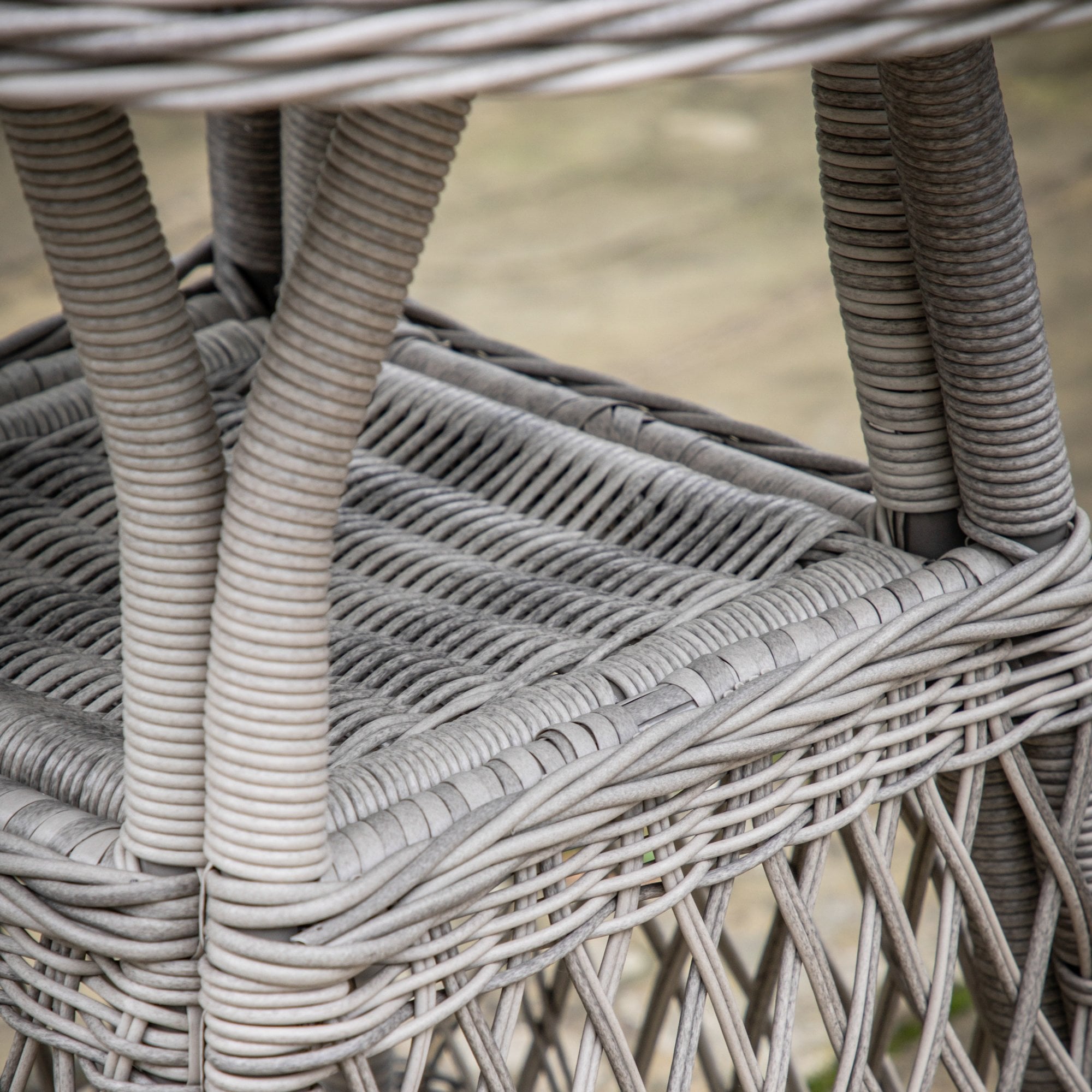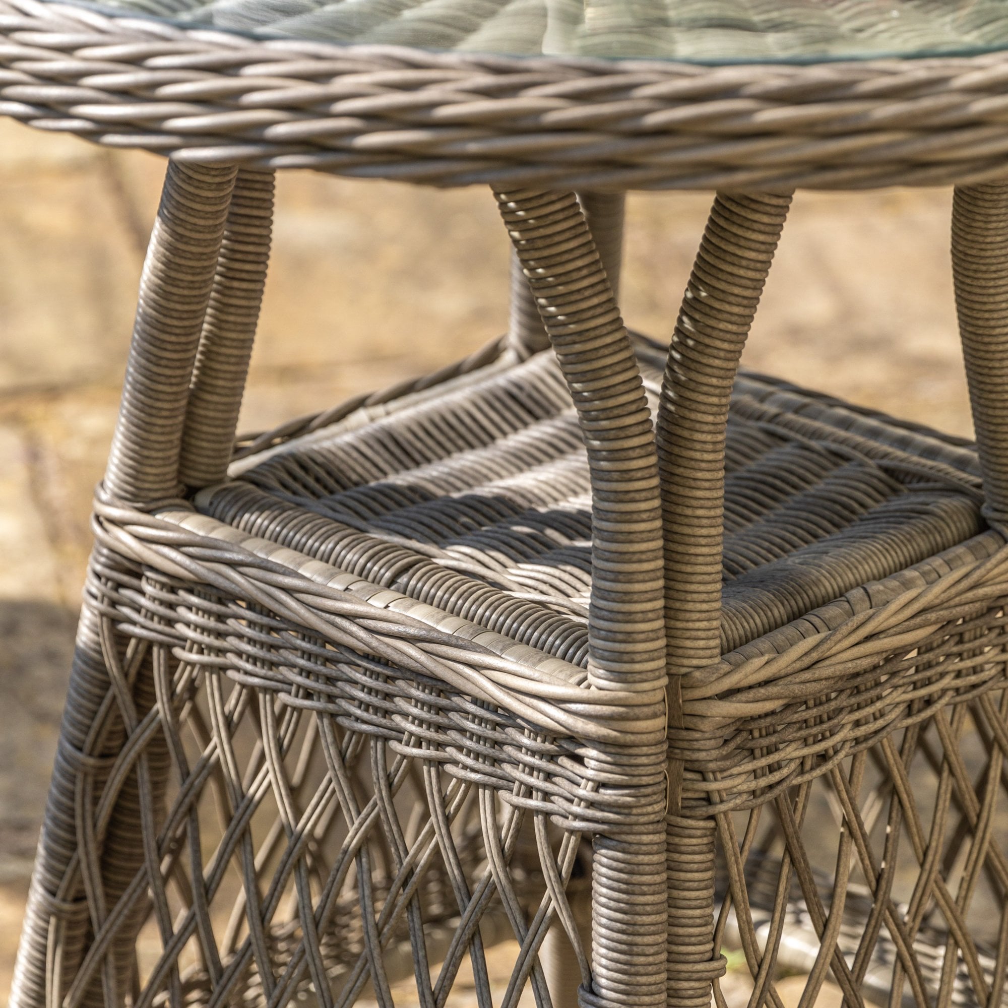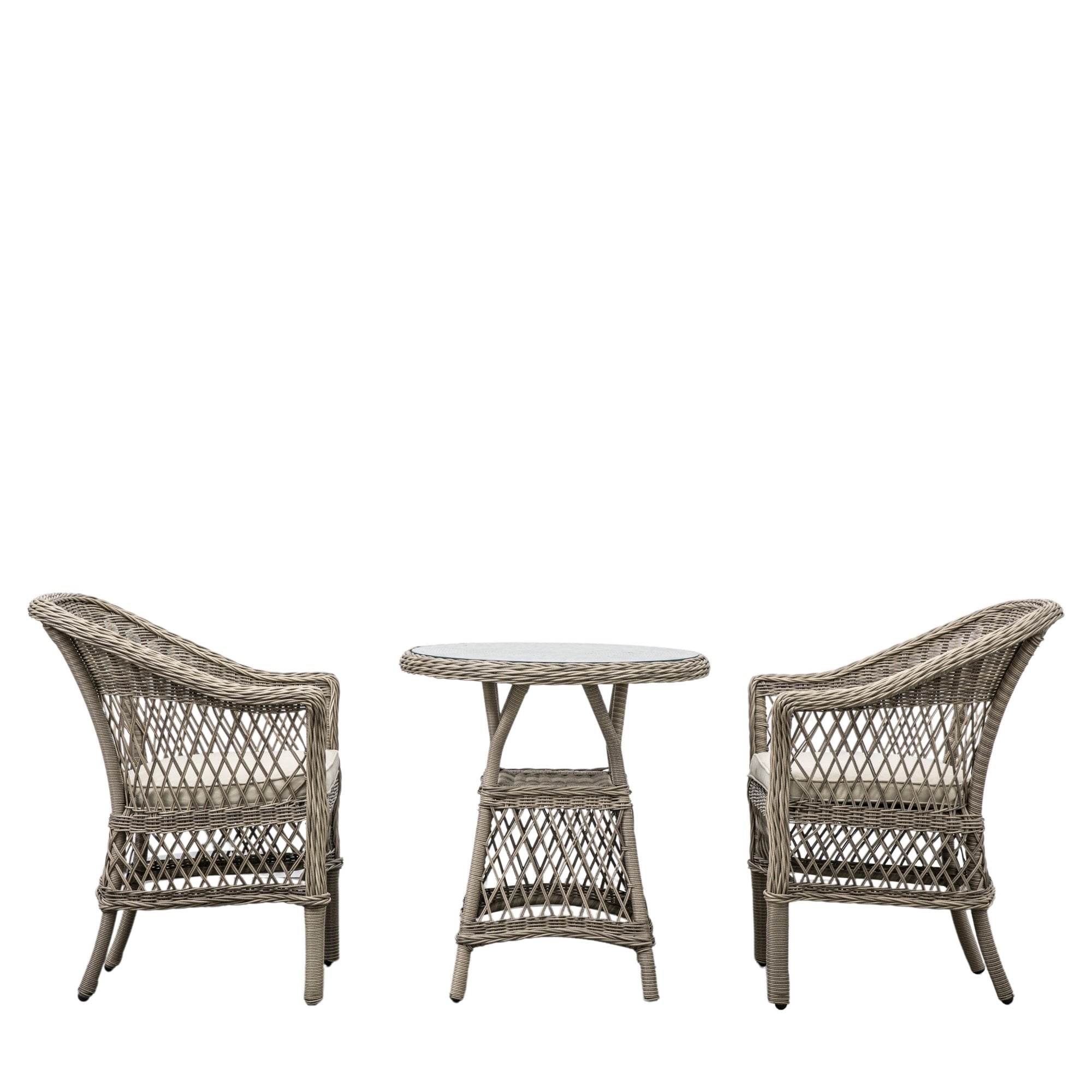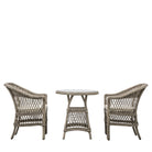 This lovely bistro set is crafted from all-weather 5mm PE rattan with a combination of close weave and open weave patterns to give a stylish design in a lovely stone colour. For comfort, the seats have luxurious showerproof cushions in a soft colour to complement the colour of the rattan. The frames are aluminium and the table top is glass. Coordinating items are available.