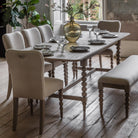 This stunning dining table will make a classy addition to any dining room, and with its extending top it is both beautiful and practical. The legs feature hand-crafted bobbin detail which is created by turning the wood on a lathe, a task carried out by the finest craftsmen. The table is made using beautiful oak solids and veneers where practical, with a very subtle lime wash tone to the finish which is soft and mellow. Matching pieces are available.