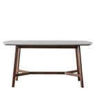 With retro mid century inspired lines this rectangular dining table features a coach end marble top and dark wood legs . The KD base enables easy access into the home and a MDF base secures to the marble for extra strength and stability. Comfortably seats 6.
