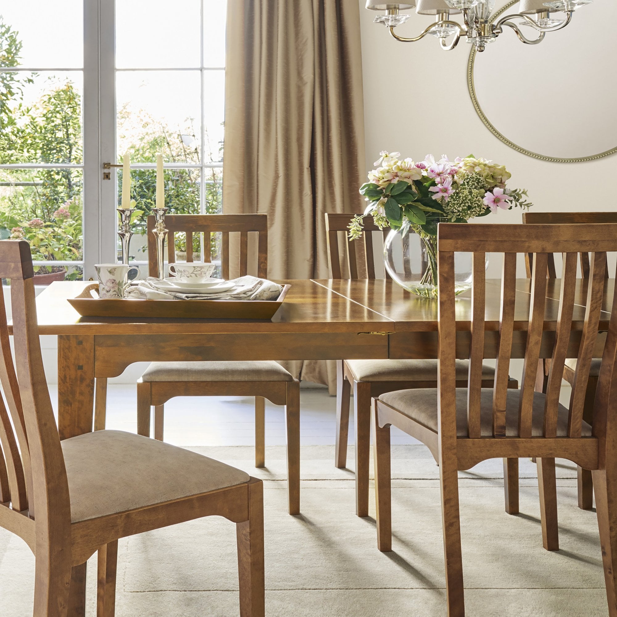 Crafted from predominantly solid birch but with some birch veneer modern materials the Laura Ashley Garrat Extending Dining Table comfortably seats 6-8 people and the extension leaf stores within the table. The table has a smooth top and is stained to enhance the natural wood effects. Only the legs need to be attached to begin enjoying this piece; full assembly is not required. Requires two people to lift, Please ensure there is assistance available to meet our driver upon delivery.