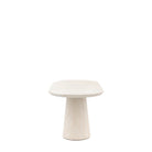 This table is a striking piece of furniture that combines modern design with raw materials. Its sleek, oval tabletop is crafted from durable concrete with a unique Travertine finish, while the two sturdy pedestal legs provide a solid base. This unique combination of materials creates a contemporary and industrial look that is perfect for both indoor and outdoor dining spaces.
