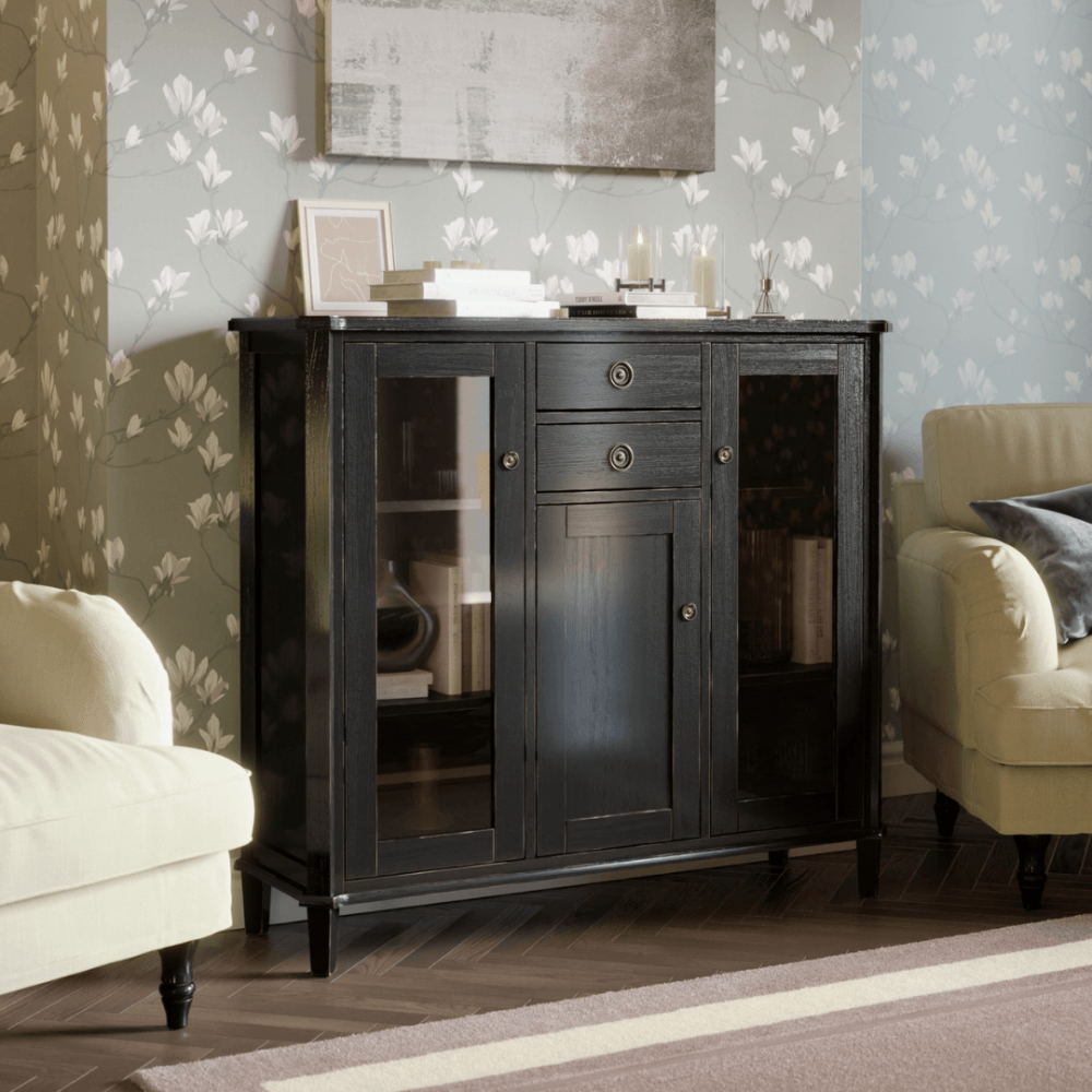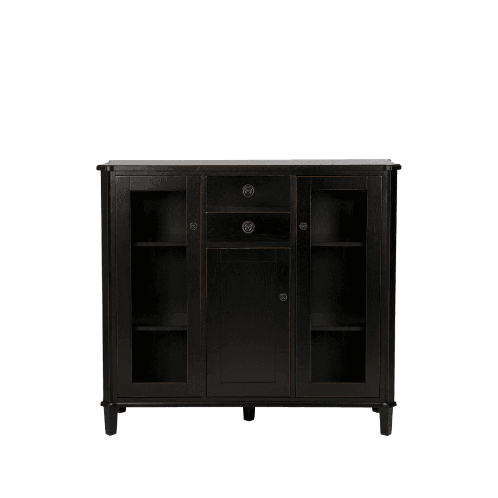 The Laura Ashley Henshaw Three Door Two Drawer Display Unit ingeniously combines both display and storage, making it a versatile addition to various spaces in your home. Featuring two elegant glass doors, it offers ample showcase space for your cherished objects. Positioned between the glass doors are two drawers and a cupboard, providing generous storage capacity. Crafted from a blend of solid wood and contemporary materials, this unit showcases a hand-painted finish with a clear lacquer, ensuring easy maintenance. Assembling this piece is a breeze; simply attach the legs, and it's ready to be enjoyed—no full assembly required. The display unit's glass fronted doors add an extra touch of sophistication.