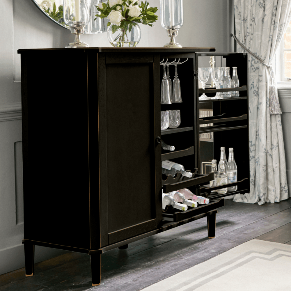 Prepare to be impressed by the Laura Ashley Henshaw drinks cabinet, featuring stunning mirrored spaces throughout its interior. This remarkable piece offers a range of practical features, including an internal drawer, ample hanging space for glasses, a wooden rack with slide-out runners capable of holding twelve bottles, and storage racks fitted inside the doors. Crafted with care from solid oak and modern materials, the cabinet boasts a hand-painted finish with a clear lacquer for easy maintenance. It serves as a true statement piece, and you'll only need to attach the legs to begin enjoying this extraordinary cabinet—no full assembly required.