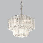 An art deco styled chrome pendant with cuEleganceed glass cylinders which individually reflect light to create a sparkling effect in a tiered formation.