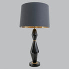 Its black unique shaped base and antique brass detailing brings an air of striking sophistication to any space, while the black shade with gold lining perfectly accentuates any existing décor.
