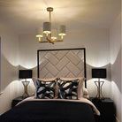 The Nico Chandelier is a stunning 4 arm lighting fixture designed to bring an air of elegance to any space. Its antique brass finish enhances the luxurious feel, while 4 x opal cylinder shades with gold lining cast a warm tone of light. This striking design provides both ample illumination and a refined aesthetic, making it a perfect statement piece for bedrooms rooms and lounges.