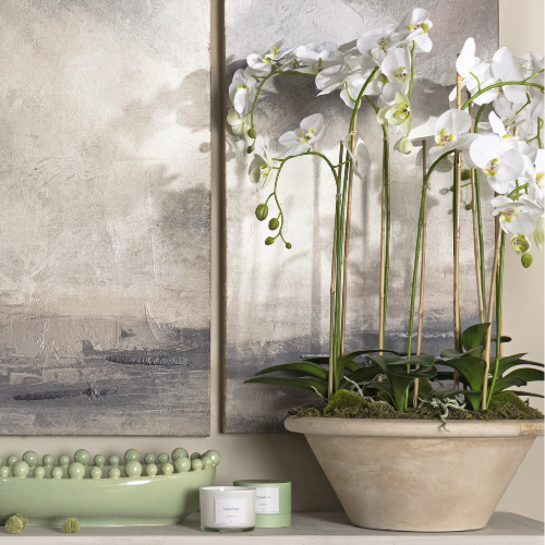 This elegant Soft Touch White Orchid comes planted in a large clay pot, adding a touch of sophistication to any room. The soft touch of the orchid's petals and the natural look of the clay pot create a calming and inviting atmosphere. Perfect for adding a touch of nature to your home or office.