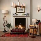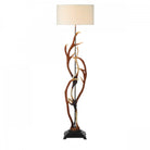Antler floor lamp hand painted in our highland rustic finish with bronze metalwork. Supplied complete with natural cream fabric drum shade. Due to the size and complexity of the product, this fitting is manufactured to order with an extended lead time. The Antler floor lamp is supplied fully assembled and delivered on a pallet.