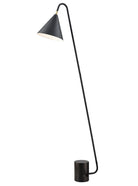Matt black finish floor lamp on a black marble base. The shade is adjustable and has a white interior. There is an in-line dimmer switch on the cable.