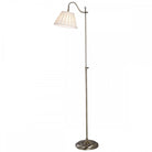 The SUFFOLK height adjustable 1lt Rise & Fall Floor Lamp is finished in antique brass, has a cream faux silk pinch pleat tapered directional shade, and is foot switched.