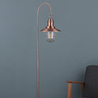 The 1lt Floor Lamp boasts a copper frame and caged, clear glass shade.