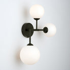 The elegant Euan wall light features matt black powder arms that hold three round opal glass shades creating an understated cosmic aesthetic.