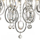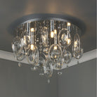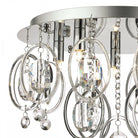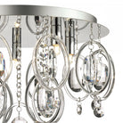 The Evangeline is a contemporary glass and crystal flush ceiling light with bags of style. The faceted crystal lozenges hung in the clear glass loops catch the light and the beads add sparkle. A unique design, this 5 light ceiling fitting will bring great style to lower ceilings.