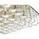 The Orella 9 light Flush ORE1350 in a Polished Chrome finish features curved faceted crystals suspended in a perfect square which gives an impressive light effect . LED compatible , the ORE1350 is part of our wonderful Orella range which features a similarly styled 5 light fitting.