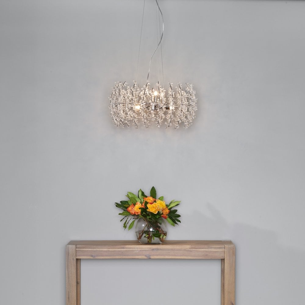 SESTINA is a delicate flush with decorative aluminium rods entwined with crystal beads. With 5 x G9 lamp holders this pretty flush gives a great light to enhance any interior space. The SESTINA range also includes a smaller flush and wall light.