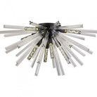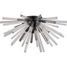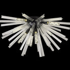The Syrah collection presents an intriguing glass shape moulded into a three dimensional triquetra. The grooves along each sized glass create an appealing optical effect which is effortlessly enhanced with the use of tubular lamps. The wide variety of fixtures available in this range span from a 6 light semi flush to an impacting 32 light pendant. The complementing wall lamps available allow for further application built around the same lighting family. Each frame can be chosen with either a brown oxide, polished nickel or matt black frame with either clear, champagne gold or smoke glass.