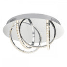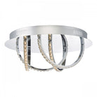 A striking and contemporary optical illusion. Playful loops of LED lit crystal are reflected in a polished chrome ceiling plate to create the appearance of suspended hoops. Great for giving a sense of height to a ceiling. Can be dimmed using a suitable dimmer. This flush fitting is available in two sizes.