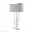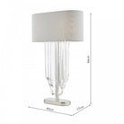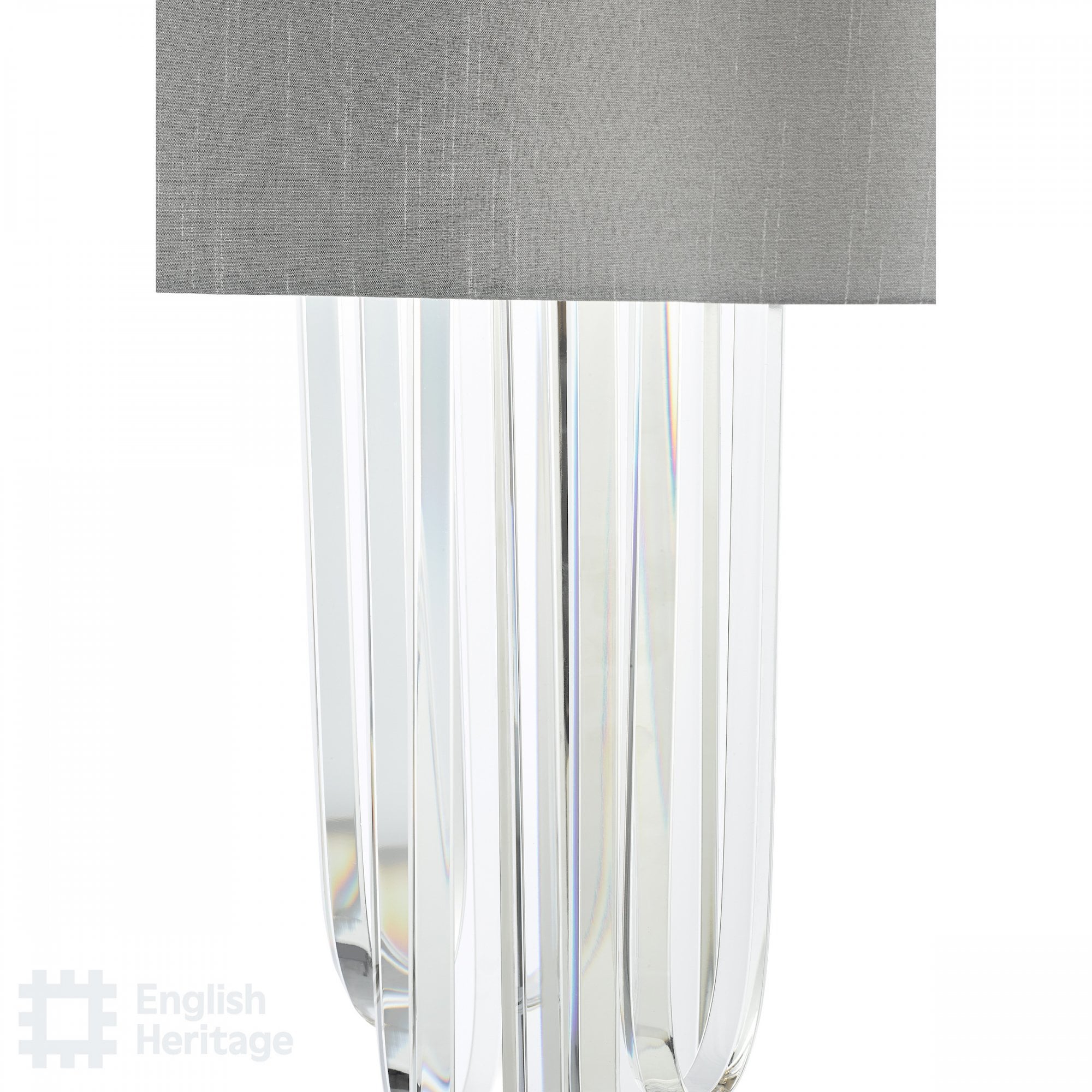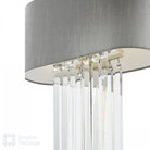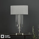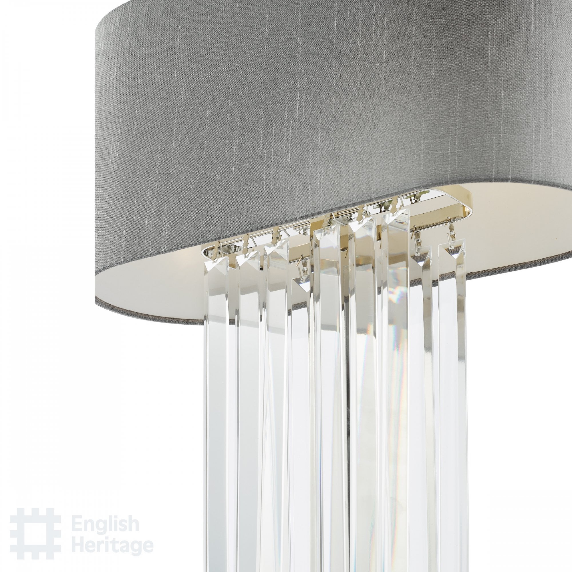 The Eltham 2 Light Swagged Crystal Table Lamp makes a great Art-Deco Statement in any room and adds to the matching Ceiling Light and Pendant. Featuring a grey faux silk shade with metallic silver lining and a frosted glass top diffuser for an opulent hotel look.