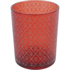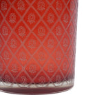 A tall glass hurricane featuring in rich deep red, measuring 10 x 10 and 12 cm in height.