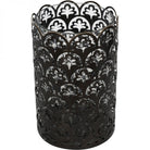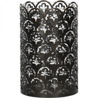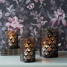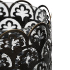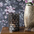 Classic hurricane with clear hammered glass drum surrounded by intricate metalwork featuring Laura Ashley Musica pattern, finished in gilded bronze. The large measures 26 cm in height. Available in three sizes.