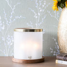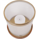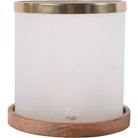 Timeless drum shaped hurricane featuring white frosted glass complete with bramble motif and finished with a gold coloured metal rim. The hurricane measures 26cm diameter by 26cm height and the frosted glass casts a warm, soft light.