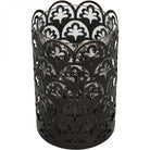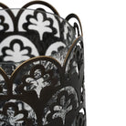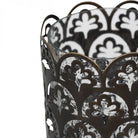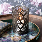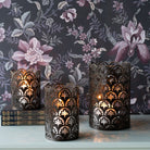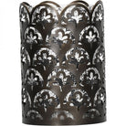 Classic hurricane with clear hammered glass drum surrounded by intricate metalwork featuring Laura Ashley Musica pattern, finished in gilded bronze. The medium measures 20 cm in height. Available in three sizes.