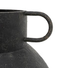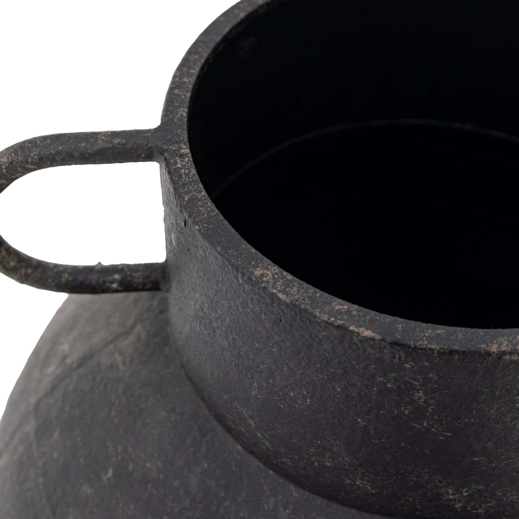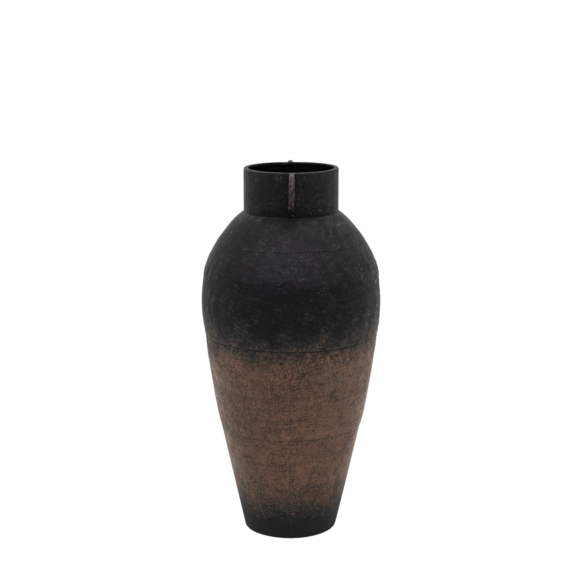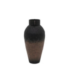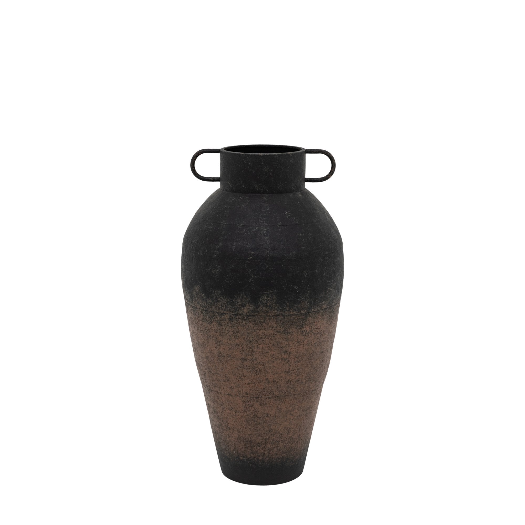 This two-handled vase features a sleek, tapered silhouette with a unique ombre effect that transitions from deep charcoal to warm, weathered brown.