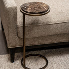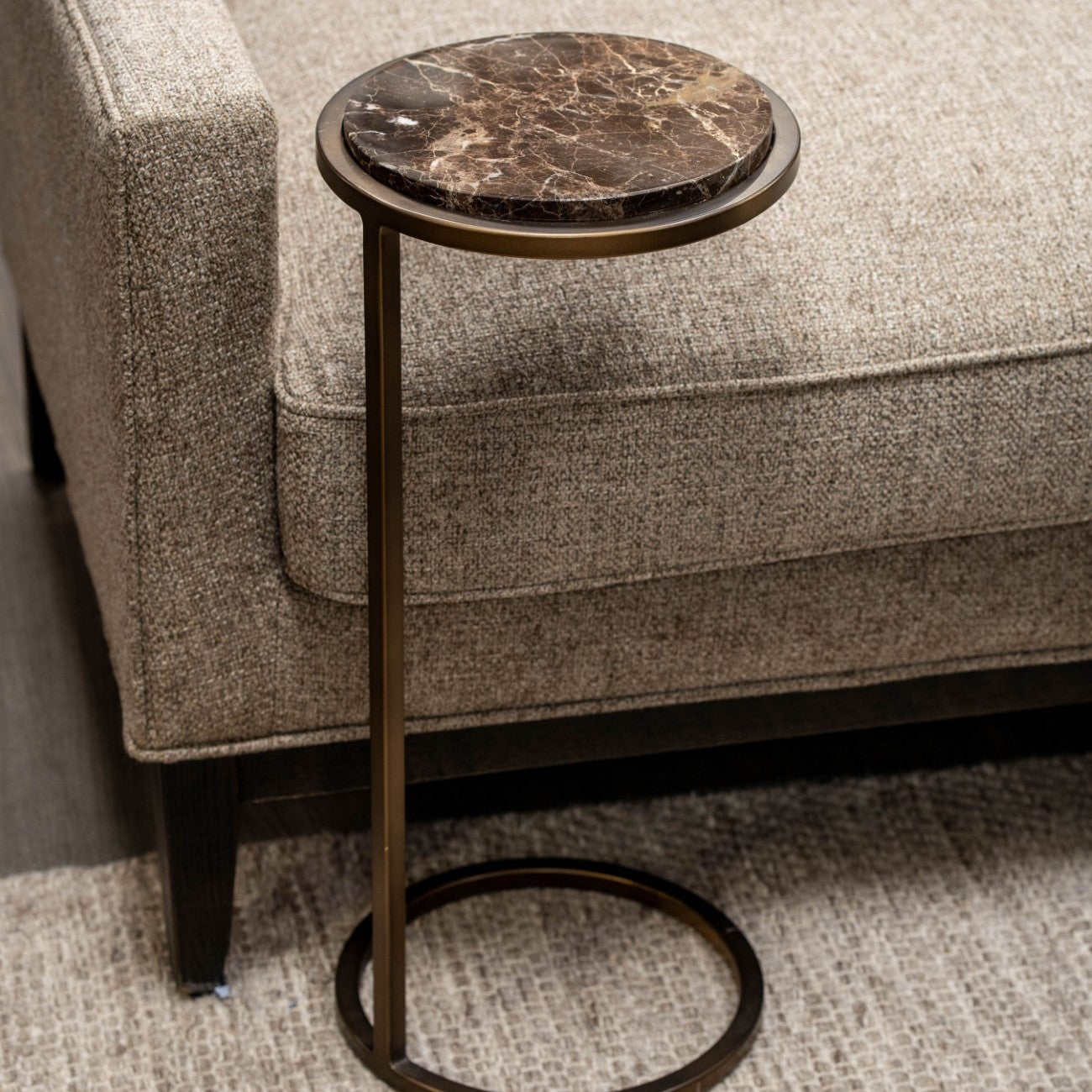 The Iota Side Table in Brown Emperador with a brushed metal finish in smoked gold is a stylish and stable piece of occasional furniture. The elegant table features a rich, warm Brown Emperador Italian marble top with intricate natural veining, making each piece unique as this is a natural product. This marble top is complemented by a sleek, brushed metal base, giving the table a contemporary and polished look.