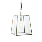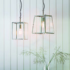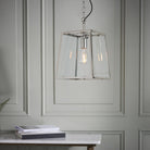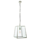 Inspired by box lanterns, the Hurst ceiling pendant is the perfect complement for today's relaxed classic interiors. Finished in bright nickel and suspended from height adjustable chain with black fabric flex. Pair with vintage style filament LED lamps that are perfectly framed by the subtle tapered metalwork and large clear glass panels.