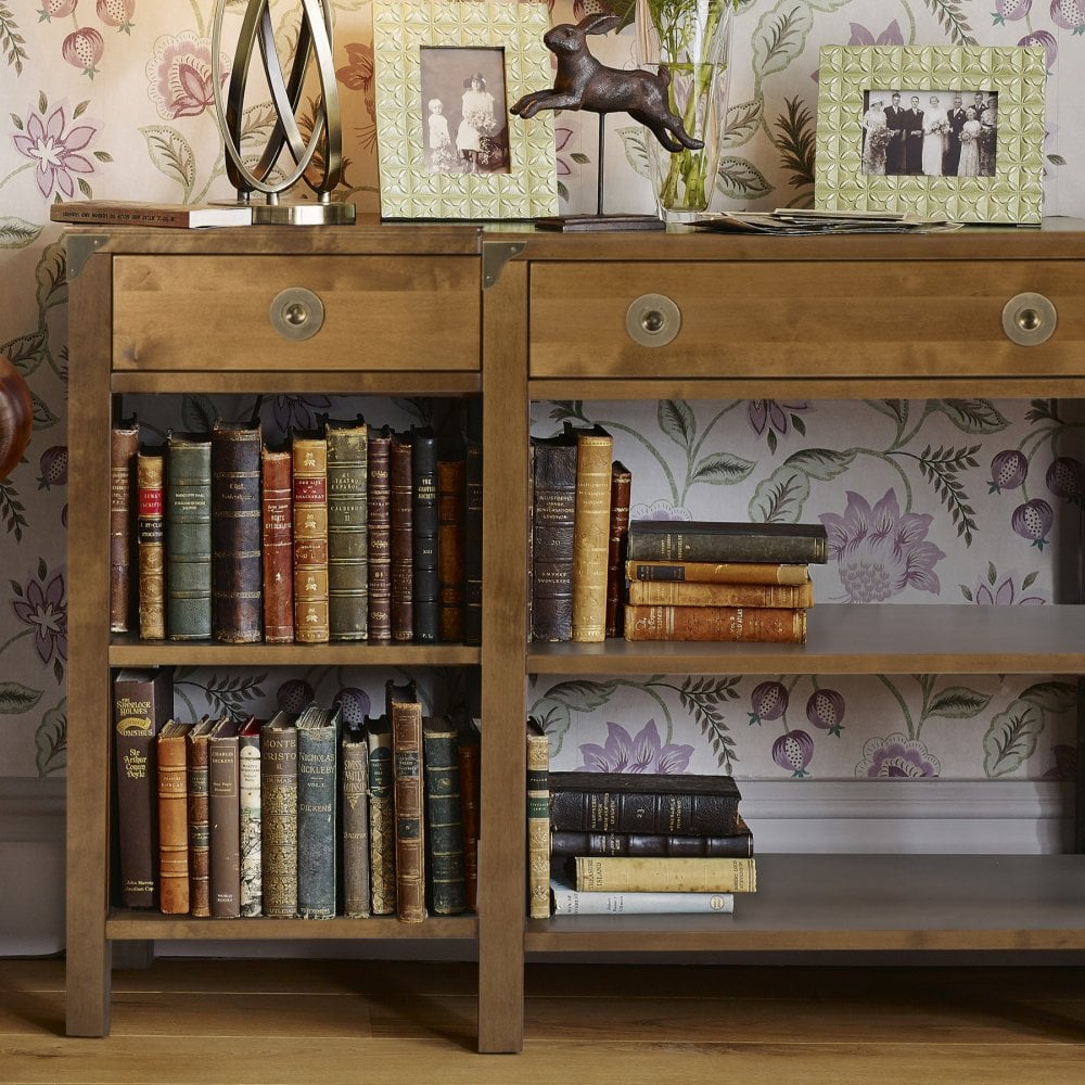 The Laura Ashley Balmoral three drawer triple console table draws inspiration from traditional period furniture with its breakfront construction. It comprises three drawers one of which is double width as well as two full width fixed shelves. It is made from predominantly kiln-dried solid birch sourced from European forests, stained to a rich colour to reveal all the natural features of real wood, it is then aged using a hand-applied patina around the edges. Several coats of clear lacquer are then applied resulting in a low maintenance surface finish. Balmoral features antique brass effect round handles and curved corner brackets with interesting wooden cross rail detail on open sides. Each item of furniture is hand finished and this together with natural features such as knots, grain and colour variation ensures that each piece is individual.