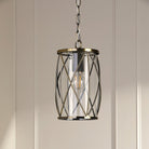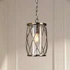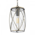 The Laura Ashley Beckworth ceiling light is a large modern pendant in a gorgeous lantern style. A slick, curved lattice in vintage polished nickel encasing a clear glass cylinder gives this hanging ceiling light a contemporary style that enhances any interior theme.