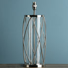 The Laura Ashley Beckworth table lamp is a modern lamp base in a gorgeous lantern style. A slick, curved lattice in vintage polished nickel encasing a clear glass cylinder gives this table light a contemporary style that enhances any interior theme.