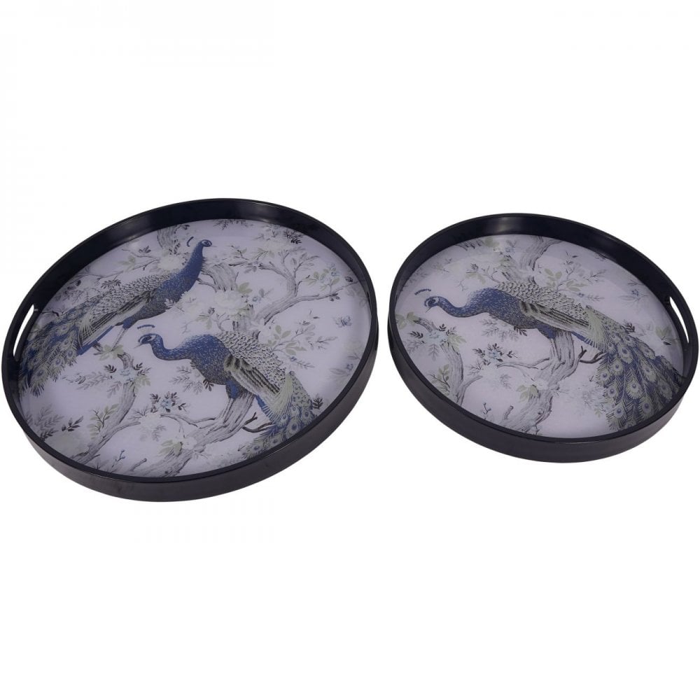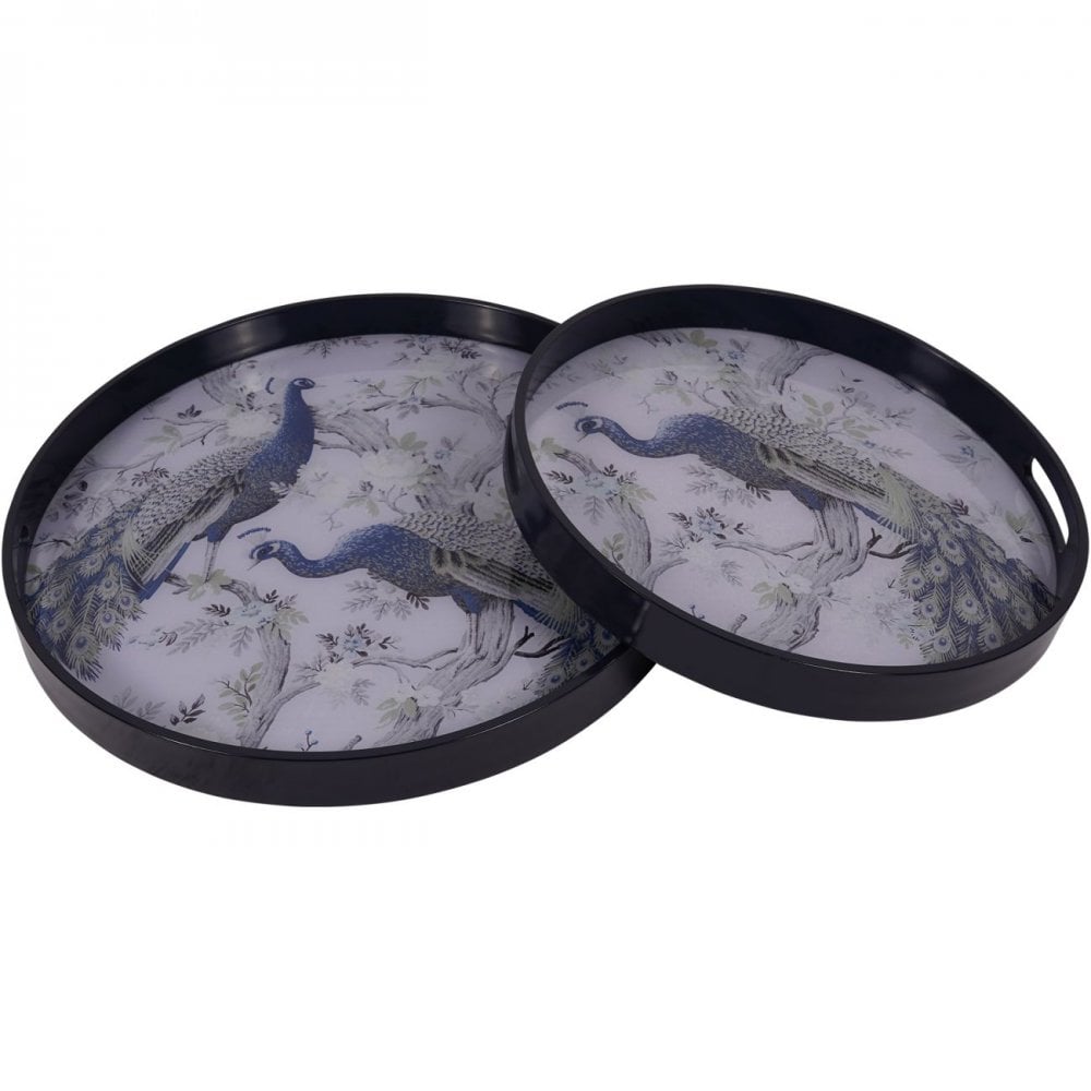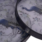 Set of two nesting trays featuring Laura Ashley Belvedere Peacock design set in a deep blue frame. Part of a collection of tables, placemats, trays and coasters featuring the same design. Large 45W X 45D X 4H, Small 36W X 36D X 4H cm.