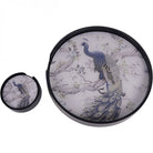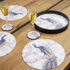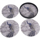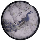 Set of four placemats in matching holder featuring Belvedere Peacock design set against a deep blue border. Part of a collection of tables, placemats, trays and coasters featuring the same design. Each placemat measures 30 x 30 cm.
