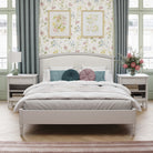 Its refined design is enhanced by a beautifully upholstered headboard, framed by a gracefully curved cap rail for a touch of timeless sophistication. With its unique craftsmanship and classic charm, this bed brings both style and character to any bedroom.