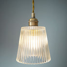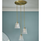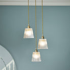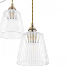 The Callaghan 3 Light Pendant by Laura Ashley features a fluted solid glass shade, with a feature twisted gold fabric cable. This light is perfect for a retro industrial style in a stairway or dining room.