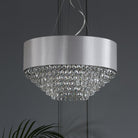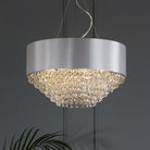 In a lovely combination for summer, the sophisticated Laura Ashley Carrington pendant ceiling light features a glittering cascade of tiny faceted glass squares that fall to a central point. The crystals are enclosed in a cool grey faux silk drum shade with a brushed silver metallic lining for a super-smart, elegantly timeless yet totally contemporary look.