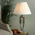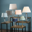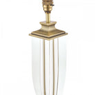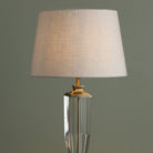 The Laura Ashley Carson table lamp is a rather grand statement table light with a solidity belied by the clear, cut crystal body, hand polished to give a smooth surface. Standing foursquare, the metal base supports the column-shaped body, reminiscent of the shape of a slender classical vase. This handsome table lamp sports a warm antique brass finish.