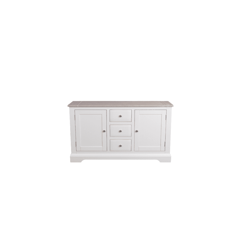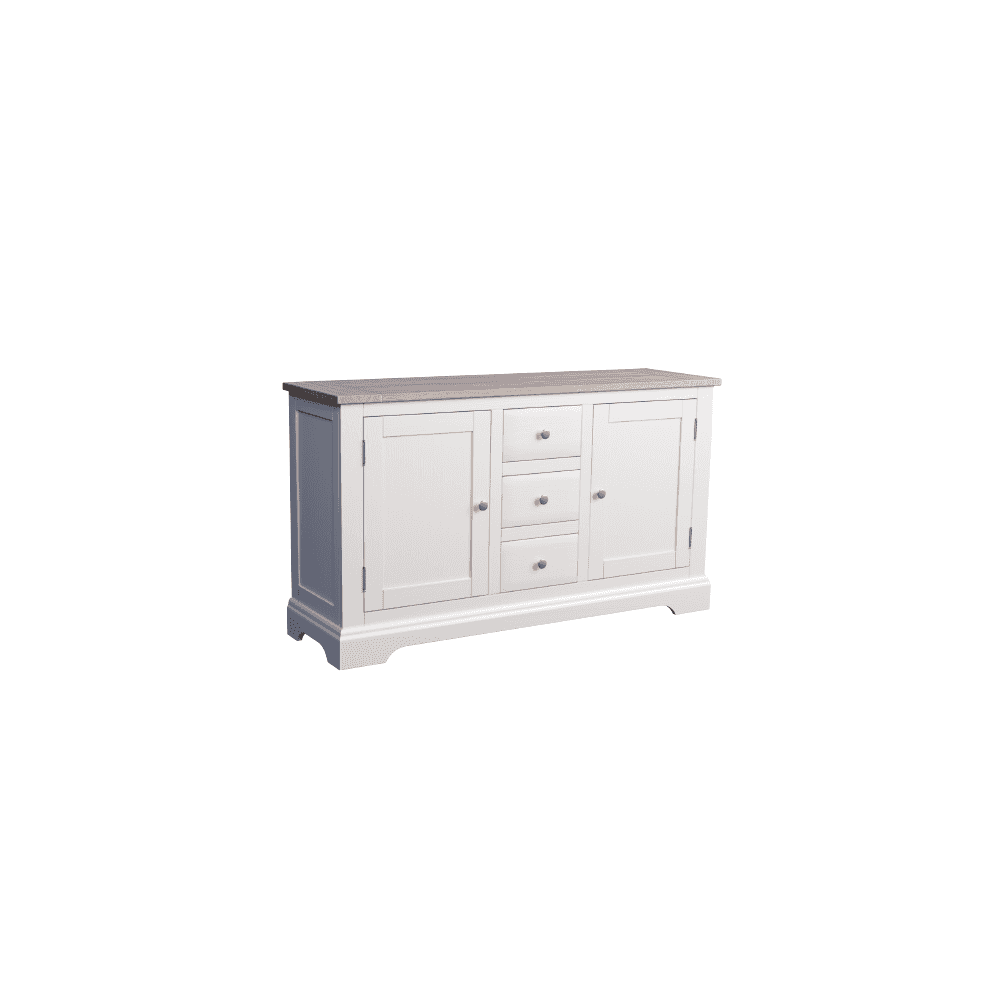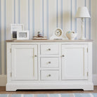 Classically elegant, the hand finished Laura Ashley Dorset 2 Door 3 Drawer Sideboard features a gentle chalky finish that works perfectly with the ash top whilst steel effect handles and hinges add a contemporary twist. And the individual character of the piece is enhanced by lightly distressed edges. The sideboard benefits from ample storage space with both cupboard and drawer space aplenty. Requires two people to lift, Please ensure there is assistance available to meet our driver upon delivery.
