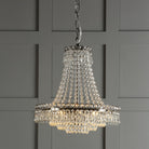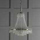Discover classic elegance with Laura Ashley's Enid Chandelier. Delicate crystals hang from rings to form this beautiful pendant, an eye-catching centrepiece that is an effortlessly sophisticated lighting option that is always in style. With a cascade of crystal beads flowing downwards and outwards from a narrow circlet to a wider one, from which are suspended cut droplets in ever-decreasing circles, this French-influenced ceiling light is made of clear, cut crystal, hand polished to give a smooth surface, on a metal frame finished with polished nickel.